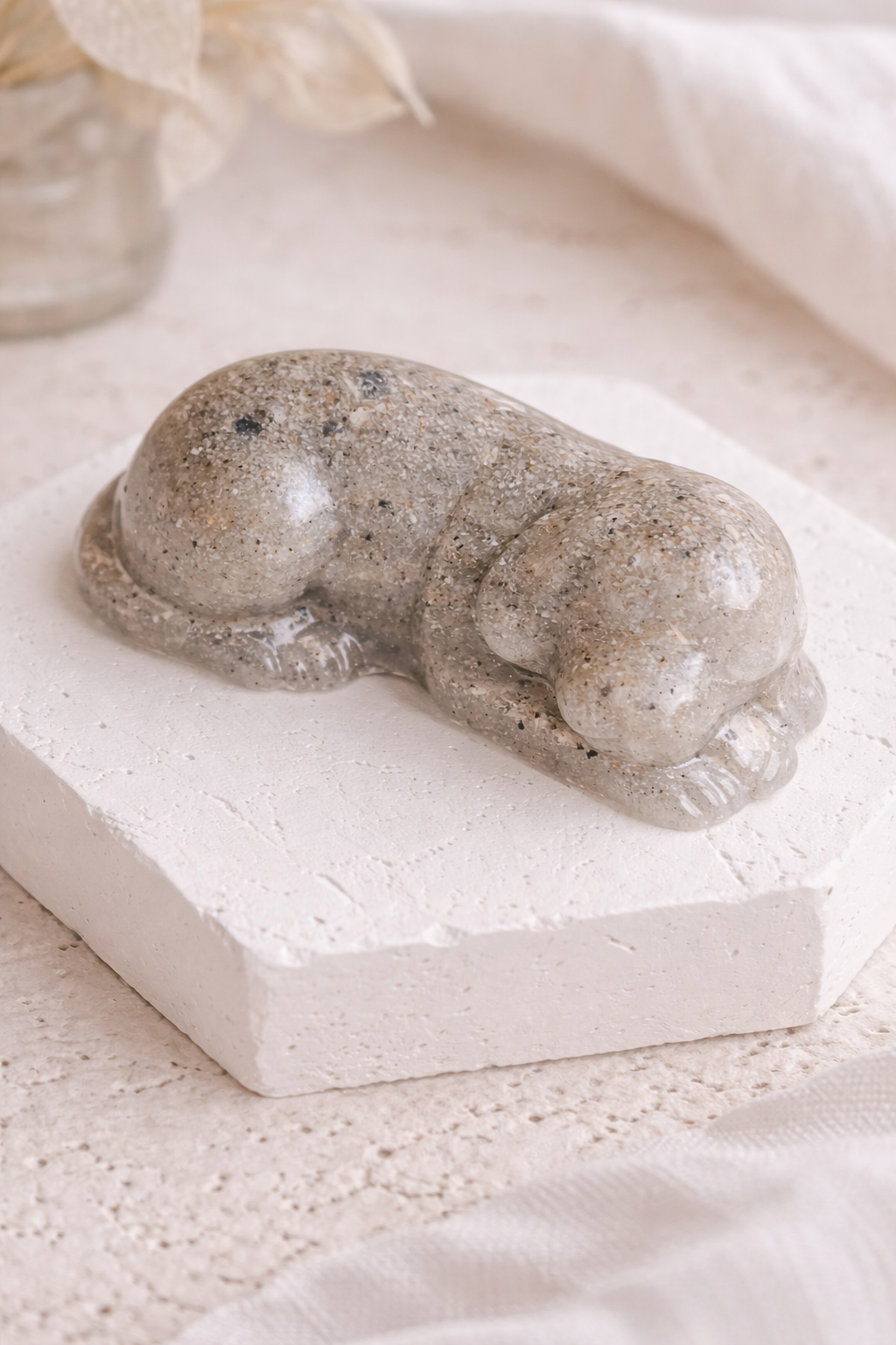 Voor een volledig beeldje gebruiken wij bij voorkeur voldoende as (minimaal 50 gram, ca. 5 grote eetlepel). Is er minder as beschikbaar? Dan kunnen we in overleg het beeldje aanvullen met schelpenzand. Dit is optioneel en zorgt ervoor dat ook met een kleinere hoeveelheid as een beeldje gemaakt kan worden.